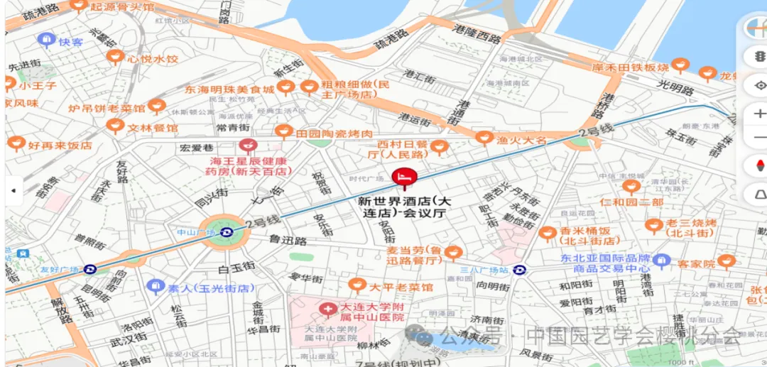 大连北站:乘坐地铁2号线,中山广场B2口下车(60分钟),步行850米。